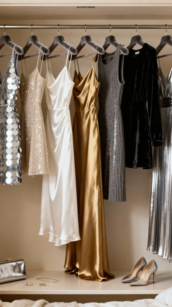 Wear: satin minis, slip dresses, sequin tops with tailored pants, soft metallics.