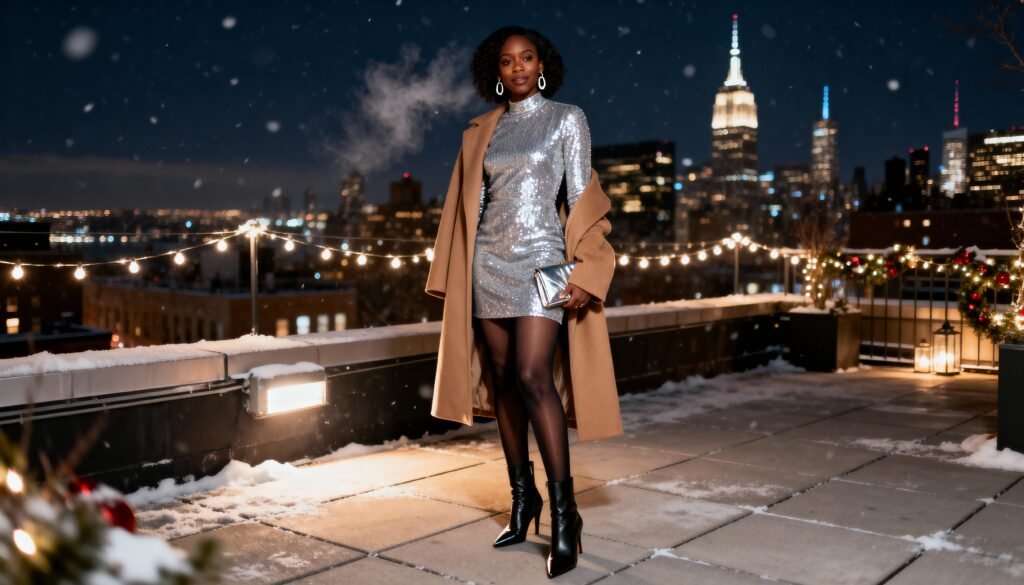 - Cold regions (NYC, Chicago, Boston): Opt for sequins with long sleeves, thicker satin, velvet touches, or a structured coat you actually love. Sheer tights, pointed-toe boots, and elegant outerwear can save the night.