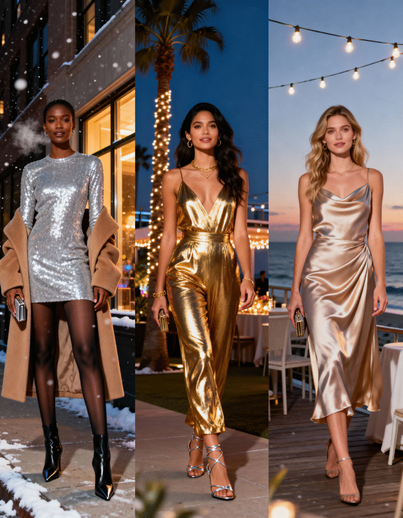 - Warm regions (Miami, LA, Southern Texas): Slip dresses, halters, satin minis, and metallic jumpsuits shine here. You can go lighter, brighter, and more open-back without freezing.