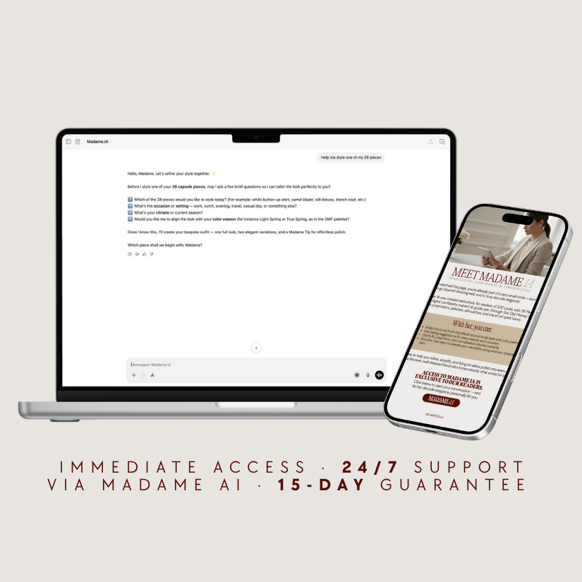 When you secure your access, you’ll also unlock Madame AI — your personal digital stylist, available 24/7 to answer questions, adapt outfits to your body and lifestyle, and help you put the method into practice day after day.