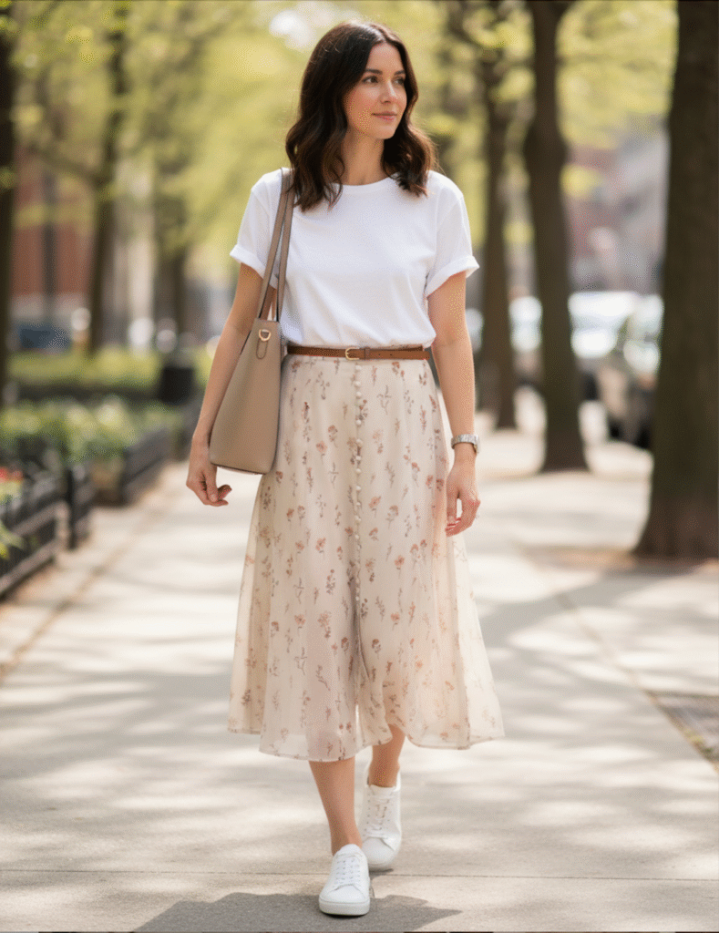 - Floral Midi Dress (Soft Print): Balanced length and soft print. Feminine without overpowering the silhouette.