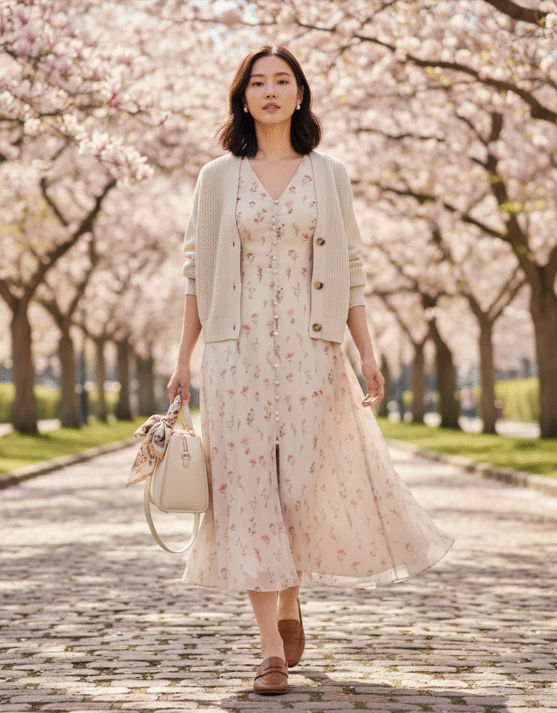 Monochromatic spring outfits elongate the silhouette instantly. The taupe cardigan creates subtle contrast, while loafers anchor the softness with structure.