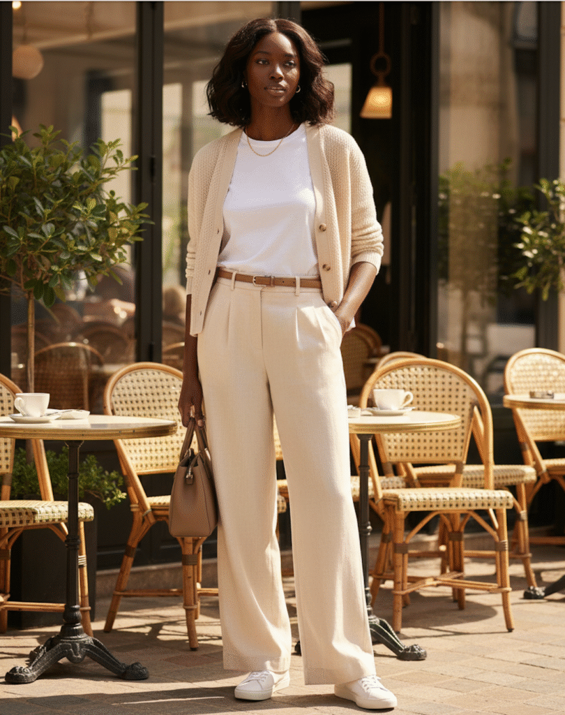 Pieces that compose the look: White cotton T-shirt (tucked) + Light linen pants + Cream short cardigan + White sneakers