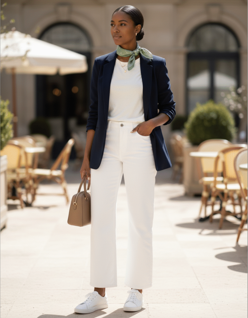 - Khaki or Beige Structured Blazer: Softer alternative to navy. Harmonizes effortlessly with creams and whites.